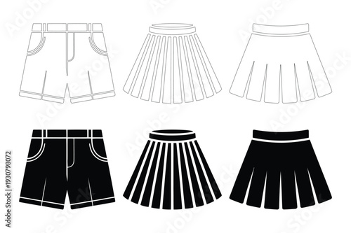 spring, symbol, pleated, short, collection, style, apparel, garment, clothes rack, fashion, vector, skirt, bottom, lady, textile, outline, clothing, set, casual attire, summer, silhouette, sporty, outfit, woman, wear, illustration, fabric, pattern, icon, design