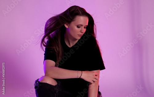 woman, model, fashion, beauty, hair, purple, background, light, posing, studio, portrait, young, style, attractive, trendy, elegant, glamour, coiffure, brunette, make-up, colourful, modern, artistic, expression, emotion, feminine, sensual, delicate, soft, pretty, casual attire, clothing, jean, t-shirt, bracelet, accessory