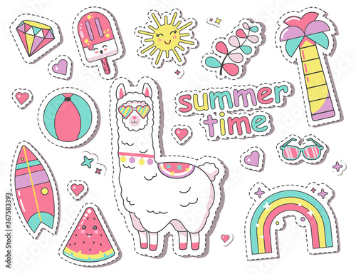 Fashion patch Badges stickers with cute llama, rainbow, diamond, surfboard, palm tree, ice cream, summer time, watermelon on a pink background