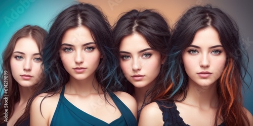 Fashion portrait of group stylish models girls posing outdoor, dark outfit on colorful background. Attractive young vogue women. Group of multi-ethnic friends. Casual fashion concept. Generative AI