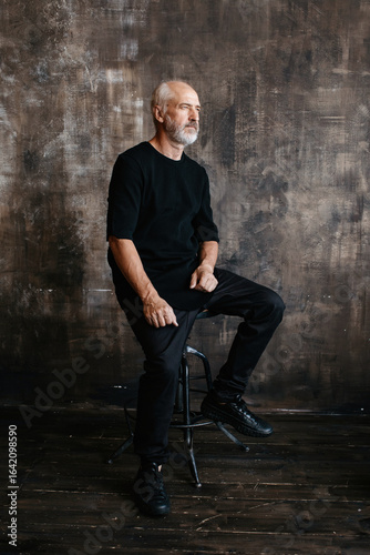alone, background, beard, bearded, baby boomer, casual attire, chair, clothes, clothing, confident, copy space, face, facial hair, fashion, fashionable, full body, full-length, garment, grey, grey hair, grey, indoor, looking away, modern, moustache, outfit, pant, pensive, portrait, serious, studio, style, stylish, thoughtful, wall, wear, wrinkle