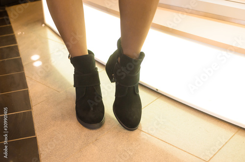 Fashionable black suede boots with heels on a girl in a shopping center, bright showy photos
