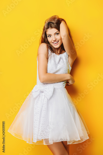 girl, summer, style, romantic, fashion, lady, fashionable, beauty, beautiful, female, woman, charming, attractive, portrait, person, people, long hair, happy, smile, smiling, young, cheerful, clothes, thought, stylish, white, yellow, background, pose, studio, inside, indoor, indoor, gorgeous, cute, model, pure, bright, colourful, happiness, dress, emotional, positive, joyful, joy, holiday