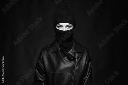 Fashionable girl in balaclava and leather coat. Black and white portrait