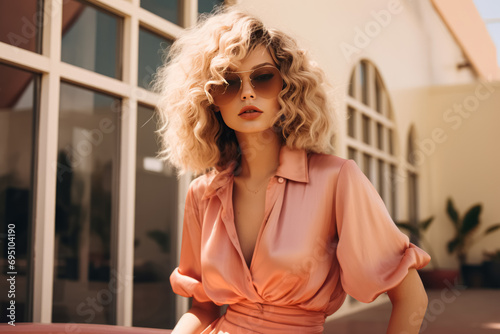 fashion, woman, style, sunglasses, blond, curly hair, chic, blouse, peach, urban, trendy, modern, model, portrait, beauty, stylish, glamour, vogue, elegance, sophistication, feminine, city, contemporary, designer, fashionable, summer, pose, accessory, outfit, lifestyle, photoshoot, youth, confident, eyewear, casual attire, attitude, luxury