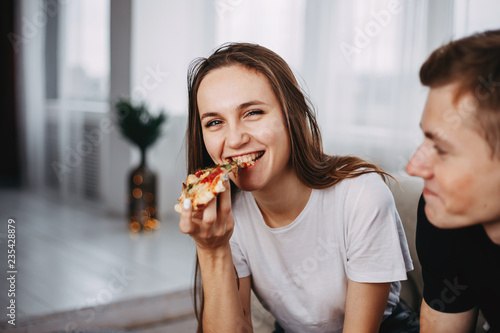 fast food, delivery, diet, people eating. young attractive woman enjoy pizza, close up.