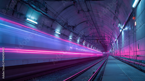 Fast underground subway train racing through the tunnels, neon pink and blue light