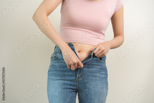 Fat belly, chubby asian young woman trying to zip it up tight jeans, obese girl excess fat around waist due to weight gain and a belly. Diet lifestyle and health care concept isolated on background