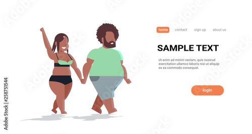 fat obese couple walking together overweight african american man woman in love holding hands summer vacation concept holiday travel full length flat horizontal copy space