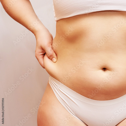 Fat unhealthy woman body. Pinch belly side. Measurement lady procedure. Medicine pinching. Anti cellulite overweight.