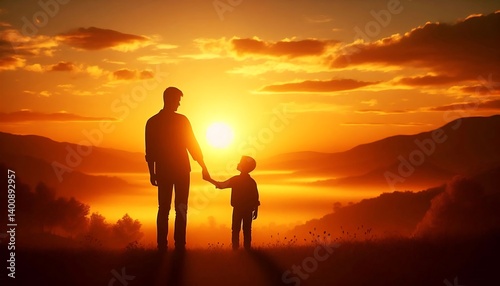 sunset, silhouette, hand in hand, bonding, parenting, love, fatherhood, landscape, horizon, golden hour, heartwarming, peaceful, warm tones, togetherness, sunrise, holding hands, artistic, connection, mountain, inspirational, tranquil scene, reflective