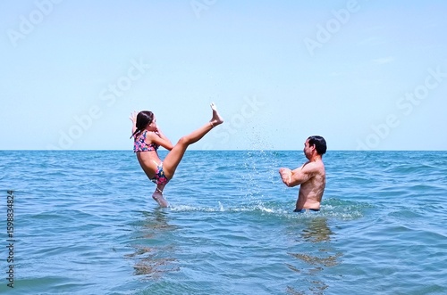 father and daughter are having fun.Girl jumps in to the water . High quality photo