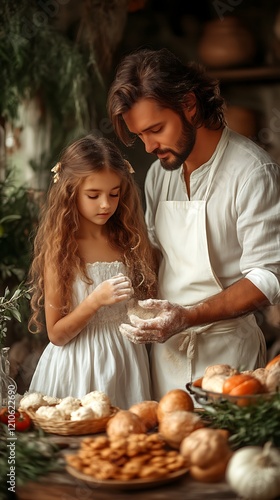 father, daughter, baking, flour, cooking, family, together, autumn, harvest, vegetable, bread, food, kitchen, home, girl, man, children, love, happiness, bonding, learning, tradition, preparing, ingredient, kneading, dough, pastry, rustic, wooden, table, healthy, lifestyle, farm, country, scene, moment, childhood, human relationships, care, warmth, joy, smile, hand