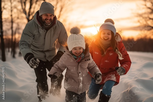 father, daughter, sunset, playing, fun, bonding, family, laughter, happiness, joy, golden hour, childhood, memory, nature, outdoors, cold, snowflake, love, eltern, children, adventure, carefree, smiling, forest, tree, sunbeam, glowing, warmth, togetherness, seasonal, jacket, hat, emotion, cheerful, holiday, weekend, genuine, candid, energy, vibrant, connection, innocence, frolic, ai