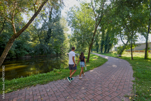Father and daughter in the park on a summer morning spending time together enjoying nature.