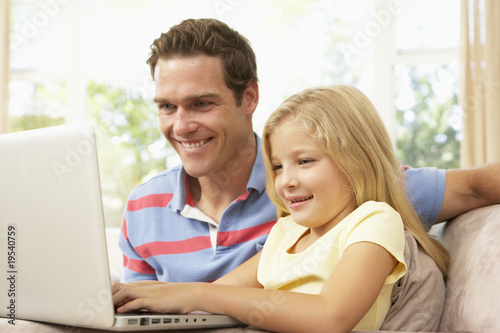 father, daughter, together, laptop, computer, woman, home, sofa, sitting, relaxing, relaxed, living room, happy, smiling, caucasian, male, female, horizontal, indoor, adult, people, person, 30s, 30s, portrait, at camera, middle-aged, mid-age, girl, eltern, father, children, young, browsing, surfing, cyberspace, technology, wireless, wi-fi