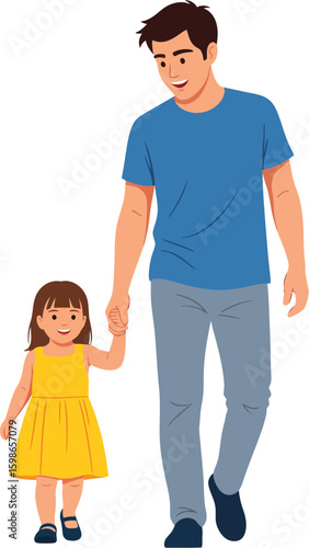 father, daughter, family, holding hands, walking, together, blue shirt, casual attire, happy, bonding, eltern, children, illustration, people, human relationships, love, care, childhood, connection, togetherness, joy, movement, simple, cartoon, friendship, trust, support, guidance, protection, fatherhood, parenthood, leisure, outing, stroll, day