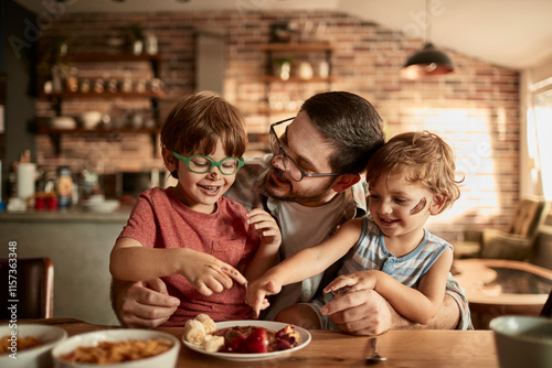people, father, children, enjoying, messy, battercake, breakfast, together, caucasian, white, man, boy, son, brother, family, meal, parenting, food, laughter, morning, table, bonding, interaction, happy, love, togetherness, playful, joy, domestic, lifestyle, cheerful, generational, fun, youth, affection, care, casual attire, warmth, dining, daytime, positive, sibling, oneness, activity, tradition, smiling, healthy, emotional, lifestyle