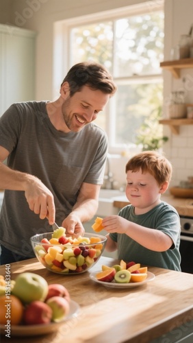 father, son, family, kitchen, cooking, fruit, fruit salad, preparation, bonding, healthy eating, childhood, domestic, warm, family time
