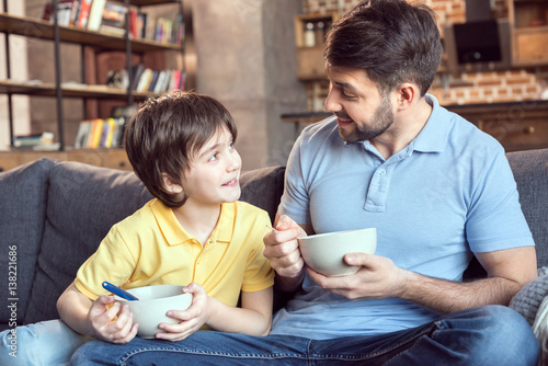 smiling, adult, people, caucasian, food, breakfast, children, family, man, european, eating, boy, childhood, children, home, together, togetherness, son, casual attire, eltern, father, father, human relationships, bowl, parenthood, preteen, father, boyhood