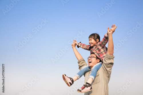 Father carrying his daughter on shoulders with blue sky backgrou