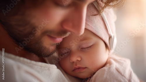 Father gently cradles sleeping infant in a cozy setting, showcasing tender bond and love between parent and child in a serene atmosphere