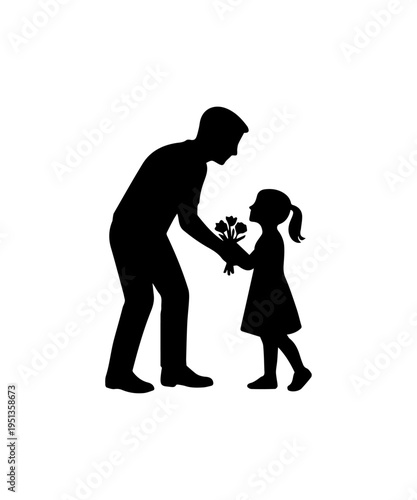 father, daughter, giving, flower, love, family, gift, children, eltern, togetherness, human relationships, man, girl, silhouette, vector, graphic, illustration, icon, black, white, background, celebration, bonding, childhood, fatherhood, care, affection, kindness, appreciation, gratitude, happy, joy, special occasion, birthday, holiday, fathers day, mother's day, generation, protection, support, sharing, fun, playful, innocence, sweet, heartwarming, tender, cut-out