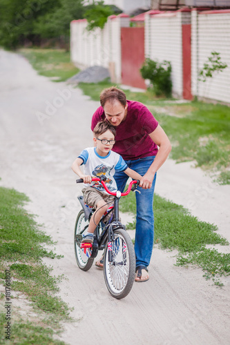 Father help his son ride a bicycle