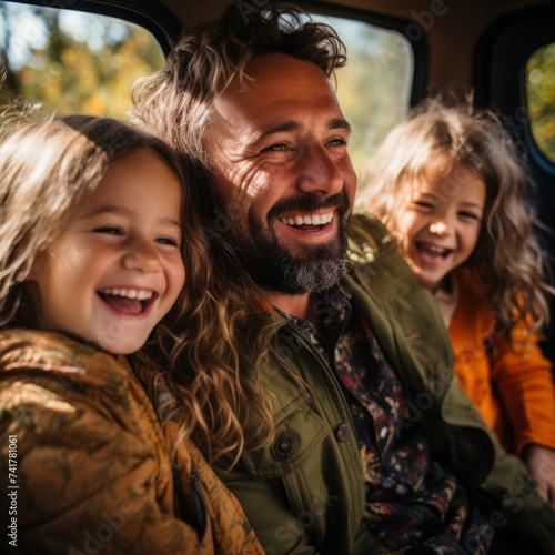 Father smiling with daughters in car