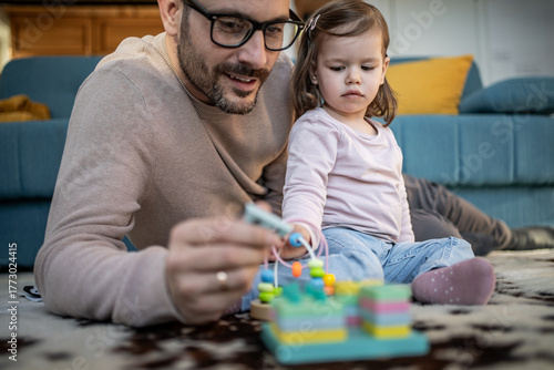 father, daughter, playing, toddler, family, home, toy, bonding, childhood, fatherhood, eltern, children, development, education, learning, domestic life, happy, relaxed, authentic, modern, casual attire, inside, care, support, growth, fun, activity, interaction, lifestyle, teaching, adult, girl, infancy, recreation, human relationships, connection, love, cheerful, innocent, positive, leisure, generation, two people, real people, closeup, horizontal, colourful, block