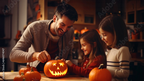 Father with daughters having fun while carving pumpkins on Halloween. Festively decorated kitchen. A glowing Jack-O-Lantern is on the table. Dad smiles and shows his children how to carve a pumpkin