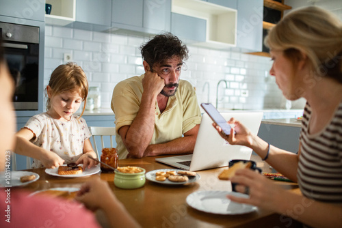 people, father, working, laptop, family, breakfast, kitchen, caucasian, man, woman, boy, girl, white, eltern, children, morning, family time, technology, multitask, household, meal, parenting, domestic life, female, male, children, daughter, son, togetherness, home, tied-up, digital, computer, eating, interaction, professional, balance, love, parenthood, 4, lifestyle, copy space