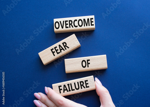 Fear of failure symbol. Concept words Overcome Fear of failure on wooden blocks. Beautiful deep blue background. Businessman hand. Business and Fear of failure concept. Copy space.