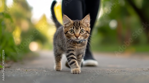 Fearful, interested kitty exploring world around, remembering new smells, sounds, places, locations. Frightened kitten gets unusual experience. Female owner taking pet out for walk for first time