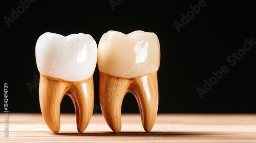 Featuring two artistic dental teeth models crafted from wood and resin, this image emphasizes the importance of dental health and presents dental aesthetics with creativity and modern design.