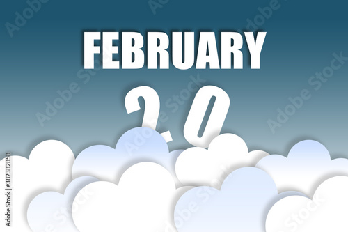 february 20th. Day 20 of month,Month name and date floating in the air on beautiful blue sky background with fluffy clouds. winter month, day of the year concept