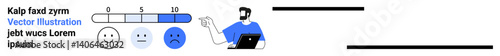 Feedback bar with numbered scale, happy face icons showing emotions from happy to sad, person with laptop. Ideal for feedback collection, evaluations, surveys, analytics, customer experience, data