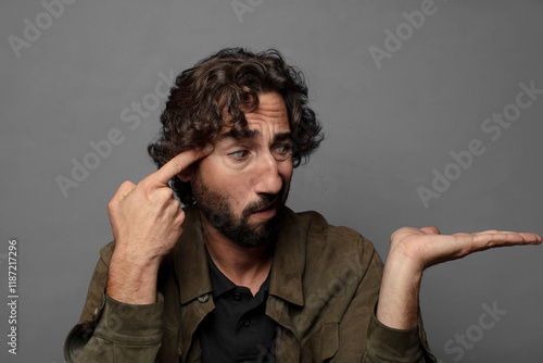 confuse, uncertain, thoughtful, clueless, uncertainty, confusion, lunatic, fool, insane, uncertain, loony, crazy, problem, puzzled, confused, solution, indifferent, thinks, mad, question, man, young, young adult, funny, beard, long hair, male, coiffure, background, copy space, blank, empty, copy, space, concept, abstract, copying