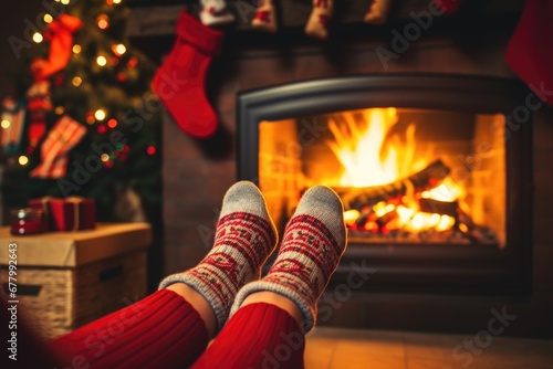 Feet in wool socks with Christmas pattern on the background of burning fireplace. A cozy winter evening. New Year.