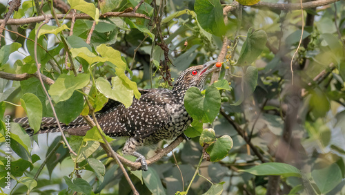 Female Asian koel (Eudynamys scolopaceus) feeding small fruits in forest habitat, West Bengal, India. Close-up wildlife image capturing feeding behavior.