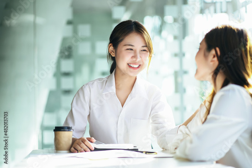 Female Asian smiles in support and puts her hand on her coworker shoulder.