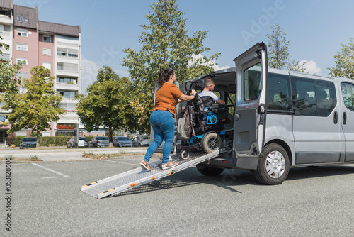 Female assistant helping a man with disability to enter an accessible vehicle, pushing him over a wheelchair car ramp.