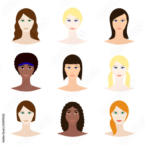 Female avatar set, woman faces icons. White and black young girls with various hair style. Female character design. Vector illustration