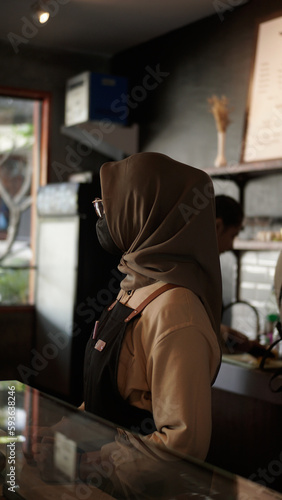 female barista wearing hijab waiting for customers behind coffee shop bar