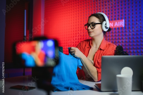 Female beauty blogger with fashionable clothes recording video in studio