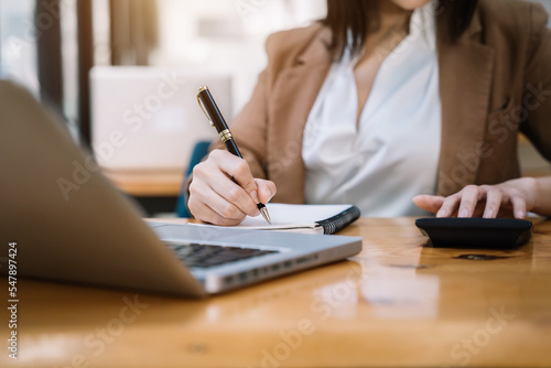 Female businessman working on desk office with using a calculator to calculate the numbers, finance accounting concept.