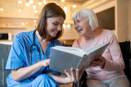 Female care assistant reading a book to a elderly lady and both looking enjoyed