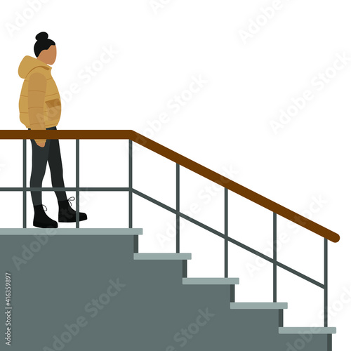Female character in a jacket goes down stairs illustration on a white background