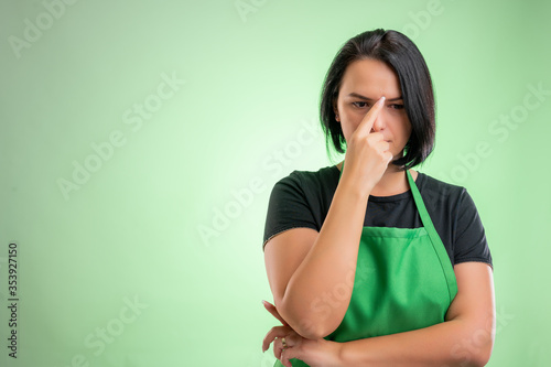 adult, apron, caucasian, chef, chicken, confidence, confident, cook, cooking, cookery, culinary, delicious, equipment, expert, finger, food, fresh, green, green background, hand, healthy, human, idea, industry, ingredient, isolated, kitchen, occupation, person, portrait, profession, professional, eatery, standing, studio shot, success, uniform, wearing, woman, work, men at work, young