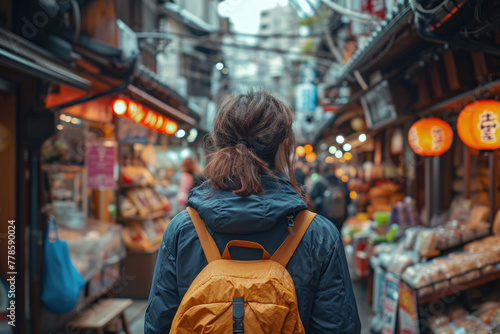 Female Digital Nomad with Backpack Explores Local Market, Digital Nomad Cultural Immersion Concept